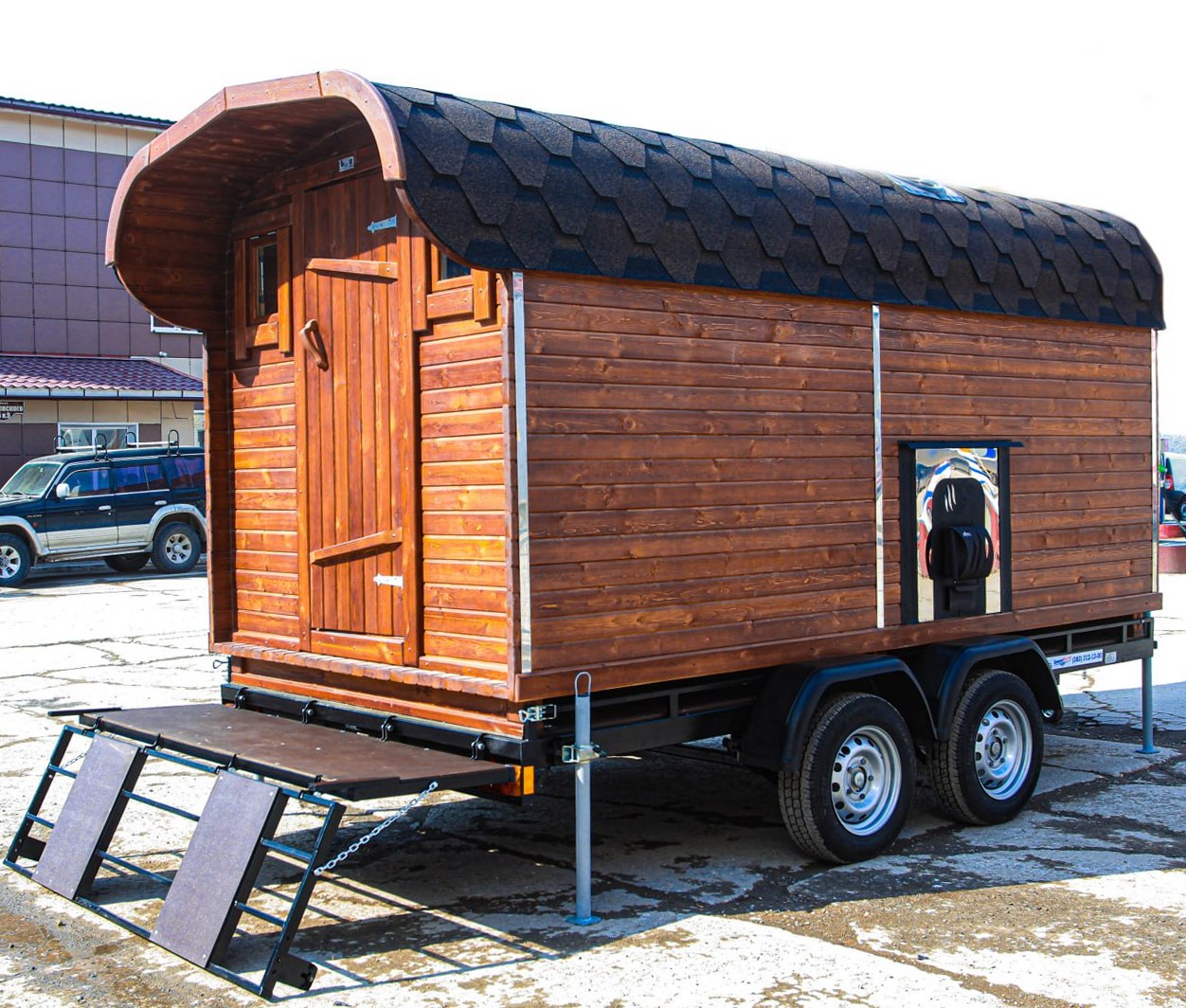 Баня-бочка «Орео» с боковым входом и панорамным окном Стильная и современная баня-бочка с боковым входом может быть выполнена длиною от 4 метров, что-бы было два отделения (парилка и комната отдыха). Полок может быть, как с двух сторон, так и угловой, в стандарте одноуровневый. Печь в данной модели расположена сбоку с топкой наружу, либо внутрь парилки. Печь можно укомплектовать баком для воды, а саму баню сделать длиною до 6 метров, комфортно разместив в ней дополнительно помывочную. В эту модель включено два закаленных стеклопакета: круглое и полукруг, которые мы можем разместить на ваше усмотрение в парилке и комнате отдыха. Обращаем Ваше внимание, по умолчанию в данной модели отсутствует бак для воды, вместо него идёт утеплённая термо-труба, которую можно заменить на бак по желанию.