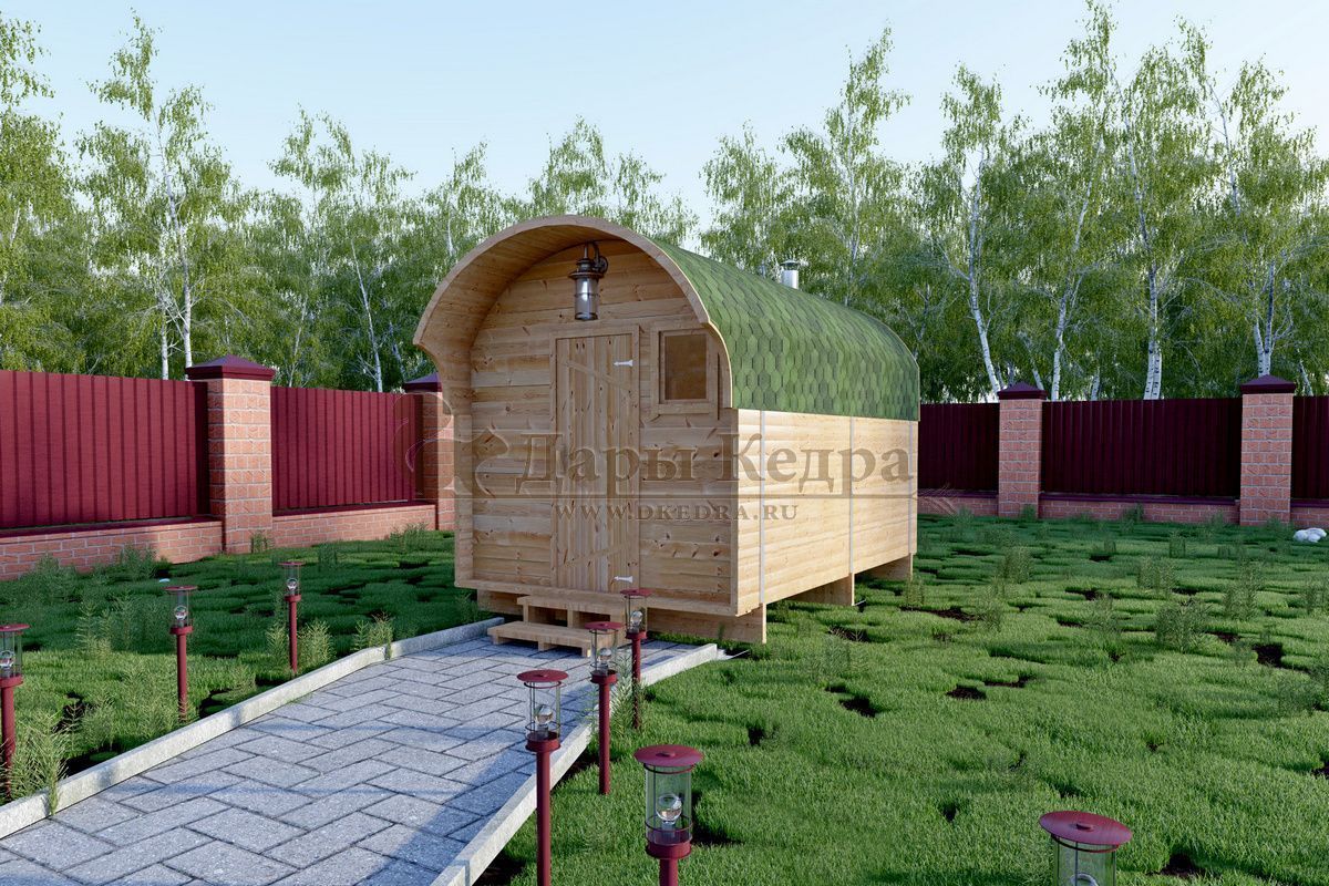Это более просторная модель за счет увеличенной высоты потолков и ровного пола. В такой модели раздевалка совмещена с моечной. Тут установлен душевой поддон, вешалка, полочка и лавочка из кедра. В парильном отделении по обе стороны расположены двухуровневые открытые полки, печь находится между ними у дальней стены. Время растопки такой бани не превышает 30 минут. По вашему желанию баню-бочку можно укомплектовать козырьком, верандой и печью с внешней загрузкой, благодаря которой весь мусор во время топки остается на улице. Баня-бочка буханка не требует полноценный фундамент, поэтому при необходимости ее можно перенести в другое место.
