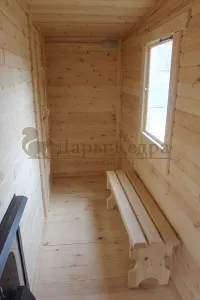 Это классическая прямоугольная модель бани с двумя отделениями: парилкой и раздевалкой. Для удобства пользования раздевалка оснащена лавочкой и вешалкой. Парилка оборудована двухуровневым открытым полком и печью. За счет небольшой конструкции баня нагревается в течении 30 минут. На просторной веранде можно оставить вещи или отдохнуть после парения. Каркасно-щитовую баню можно заказать как в готовом, так и в разборном варианте. В разборной модели готовые щиты из кедра быстро собираются в полноценное строение, что также позволяет исключить лишний строительный мусор. Такая баня не требует полноценный фундамент, поэтому при необходимости ее можно перенести в другое место.