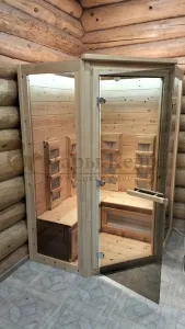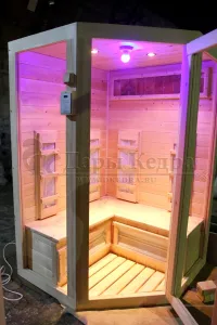 Это специально оборудованная кедровая кабина для прогрева тела человека сухим теплом. Воздух в таких парных не нагревается. Инфракрасные лучи воздействуют на тело, равномерно прогревая мышцы, суставы и органы. Керамические излучатели похожи на лампы, имеют высокую температуру нагрева, поэтому защищены противоожоговыми решетками. Тело человека в таких саунах нагревается интенсивнее. Работает кабина за счет электричества. Установка сауны в угол, позволяет рационально использовать пространство помещения. Подходит как для домашнего использования, так и для коммерции.