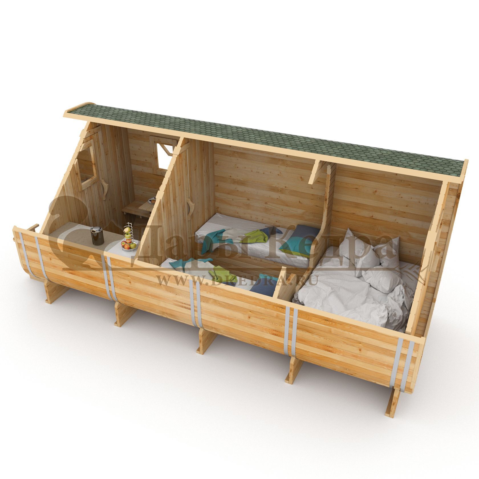 • Кемпинг садовый домик «Семейный» Домик с тремя помещениями подходит для дачного использования в теплое время года или обустройства загородных баз отдыха. Прихожая и кухня занимают одну комнату, в которой стоит стол из кедра. Две другие оборудованы четырьмя деревянными лежаками, по желанию их можно заменить на двуспальные кровати. Либо обустроить санузлом и душевой зоной. Для удобства пользования кемпинг дом можно укомплектовать верандой с лавочками или козырьком.