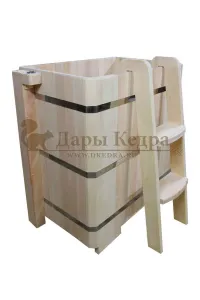 Представляет собой герметичную емкость для воды из кедра, которая предназначена для отдыха и охлаждения тела после процедур парения. Ширина прямоугольной купели равна ширине стандартных дверных проемов (78 см), поэтому занести в помещение ее можно в собранном виде. Благодаря прямоугольной форме купель хорошо впишется в угол помещения. Так же ее можно установить на улице. Прямоугольная купель оснащена лавочками, приставной и внутренней лестницей из кедра. Обручи из нержавеющей стали плотно прилегают к изделию, что позволяет равномерно распределить нагрузку воды и сохранить форму во время эксплуатации. При правильном уходе купель для бани не рассыхается и не подвергается гниению.