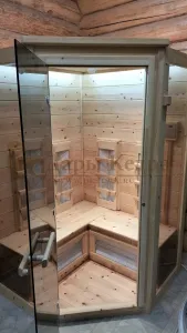 Это специально оборудованная кедровая кабина для прогрева тела человека сухим теплом. Воздух в таких парных не нагревается. Инфракрасные лучи воздействуют на тело, равномерно прогревая мышцы, суставы и органы. Керамические излучатели похожи на лампы, имеют высокую температуру нагрева, поэтому защищены противоожоговыми решетками. Тело человека в таких саунах нагревается интенсивнее. Работает кабина за счет электричества. Установка сауны в угол, позволяет рационально использовать пространство помещения. Подходит как для домашнего использования, так и для коммерции.