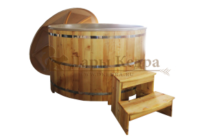Это уличная подогреваемая купель с круглой внутренней чашей из термопластика, которая имеет цельную форму вместе с сиденьями и дном. Для удобства пользования купель фурако оборудована приставной лестницей. Подогрев воды осуществляется за счет внешней печи с дымоходом. Термопластик устойчив к воздействию температур, облегчает уход за фурако и увеличивает срок ее службы.