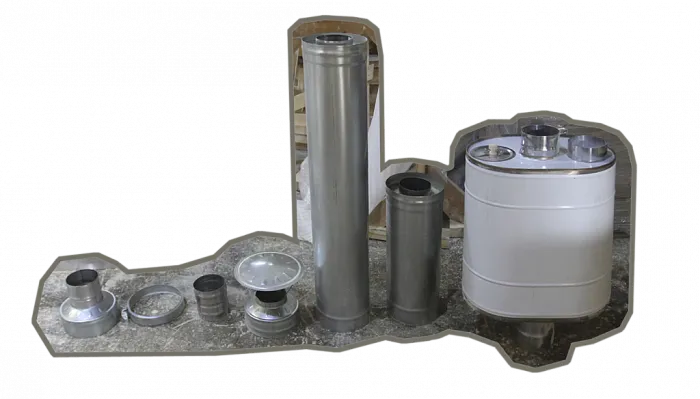 2. На печной котёл устанавливается бак с водой 1, далее адаптер 2 и старт-сендвич 3. На старт-сэндвич устанавливается труба 4, которая фиксируется с трубой 5 через хомут 6.